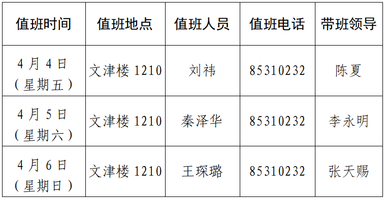 注意事项:1、按时上下班;2、保持办公场所干净整洁;3、注意安全和防火,每天定时巡查公司办公场所;4、值班结束时须做好办公室钥匙的交接工作;5、遇紧急突发情况,及时向相关领导汇报。
