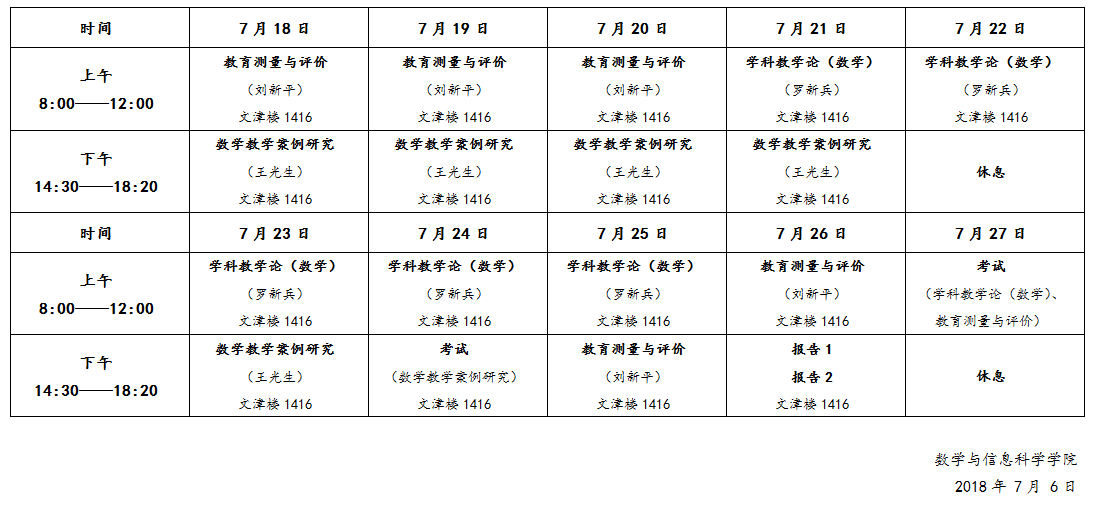 数学与信息科学公司2018级免师教育硕士暑期专业课程安排表