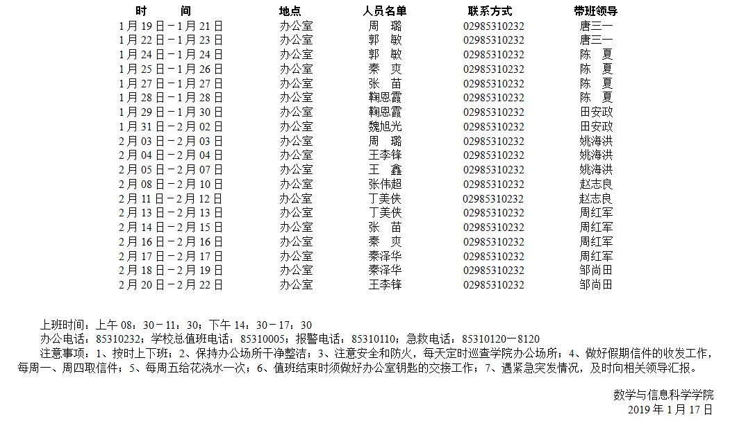 数学与信息科学公司2019年寒假值班安排