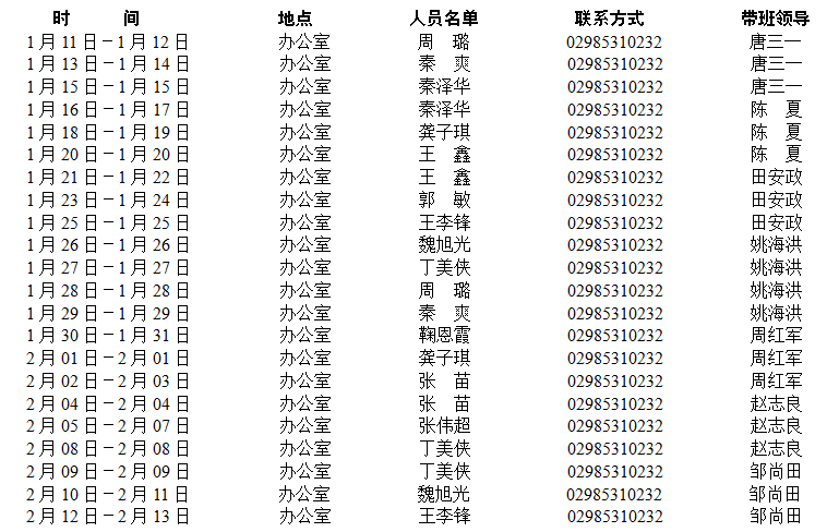 注意事项:1、按时上下班;2、保持办公场所干净整洁;3、注意安全和防火,每天定时巡查公司办公场所;4、做好假期信件的收发工作,每周一、周四取信件;5、每周五给花浇水一次;6、值班结束时须做好办公室钥匙的交接工作;7、遇紧急突发情况,及时向相关领导汇报。