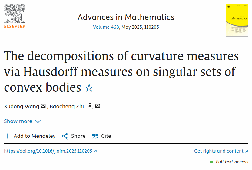 近日,公司朱保成教授及其博士研究生王旭东于2025年3月12日在Advances in Mathematics(数学进展)在线发表了题为“The decompositions of curvature measures via Hausdorff measures on singular sets of convex bodies”(曲率测度通过豪斯道夫测度在凸体奇异集上的分解)的研究论文,该论文研究了各阶曲率测度相对于不同维数豪斯道夫测度的分解公式。进一步地,通过径向映射的拉回作用,论文探讨了凸体的单位径向丛,并推导出球面曲率测度相对于不同维数豪斯道夫测度的分解公式,特别地,给出了经典 Aleksandrov 积分曲率的分解表达。