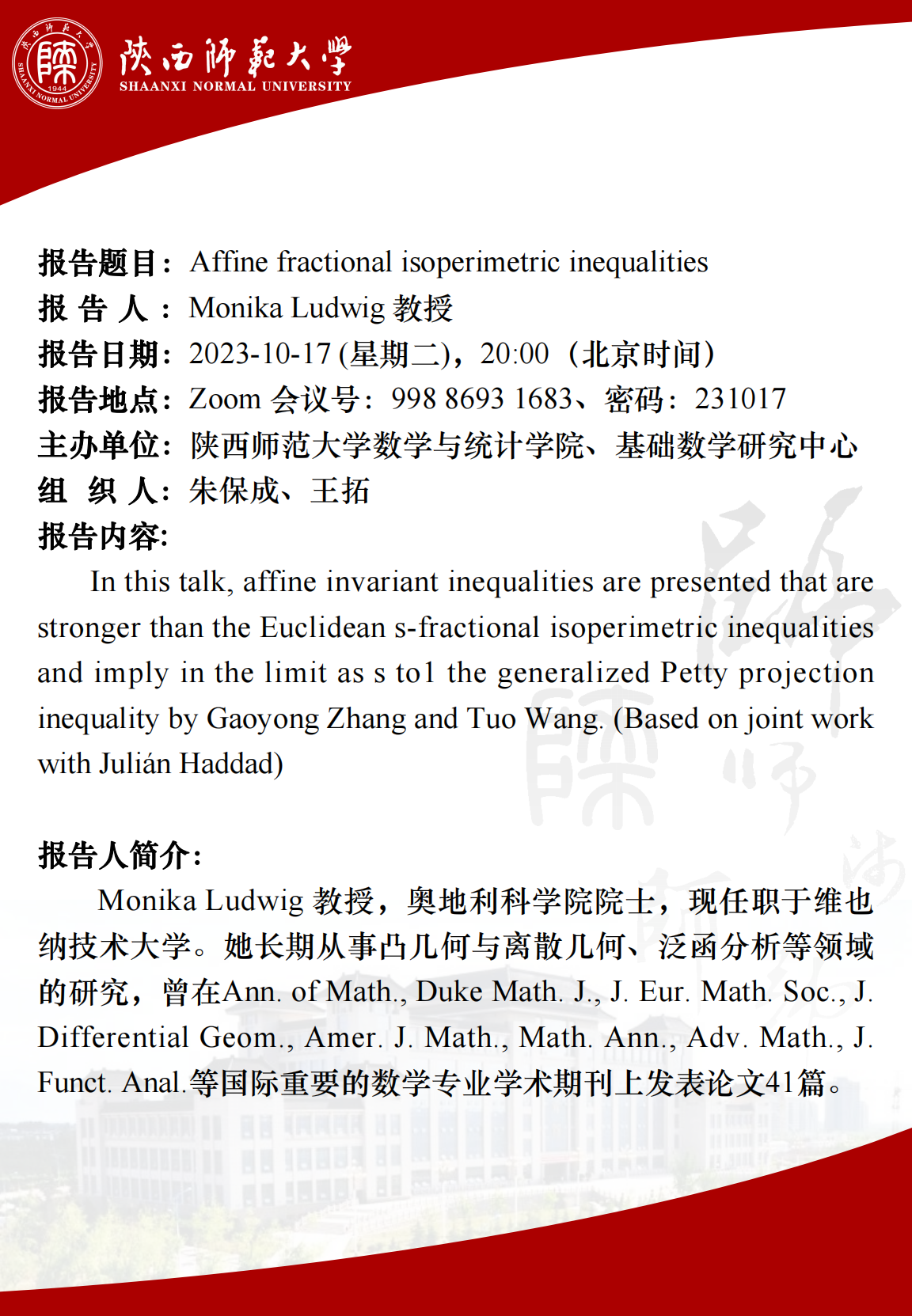 • 地点: Zoom会议号ID:998 8693 1683