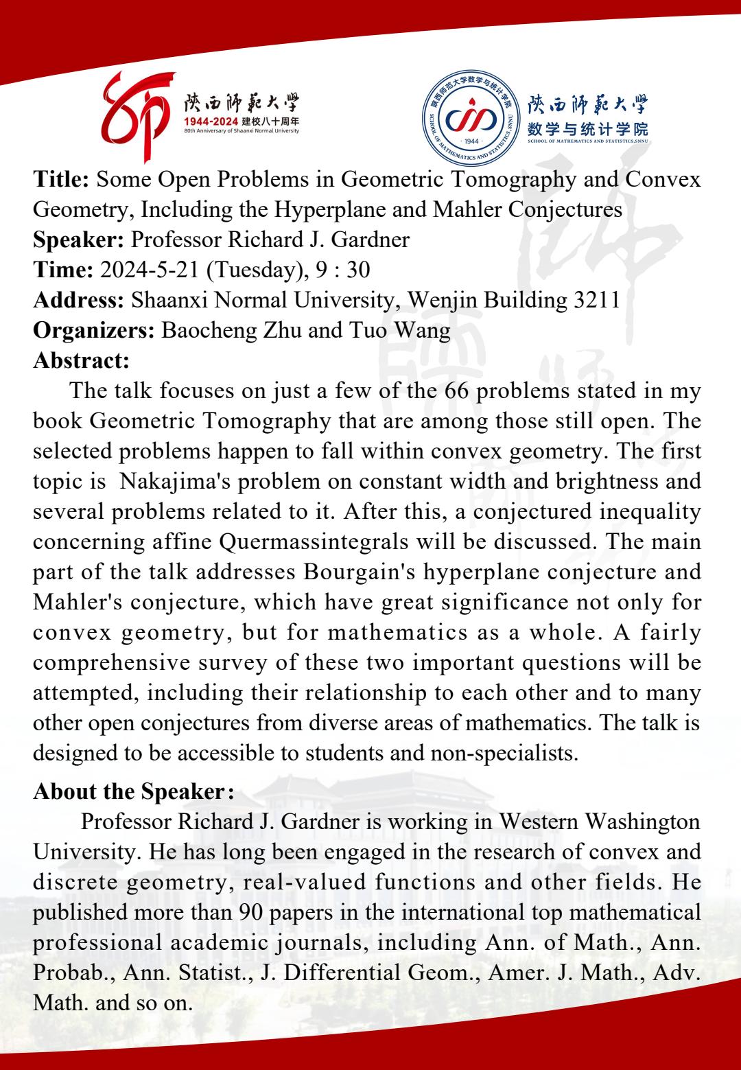 • 讲座人: Richard J. Gardner教授