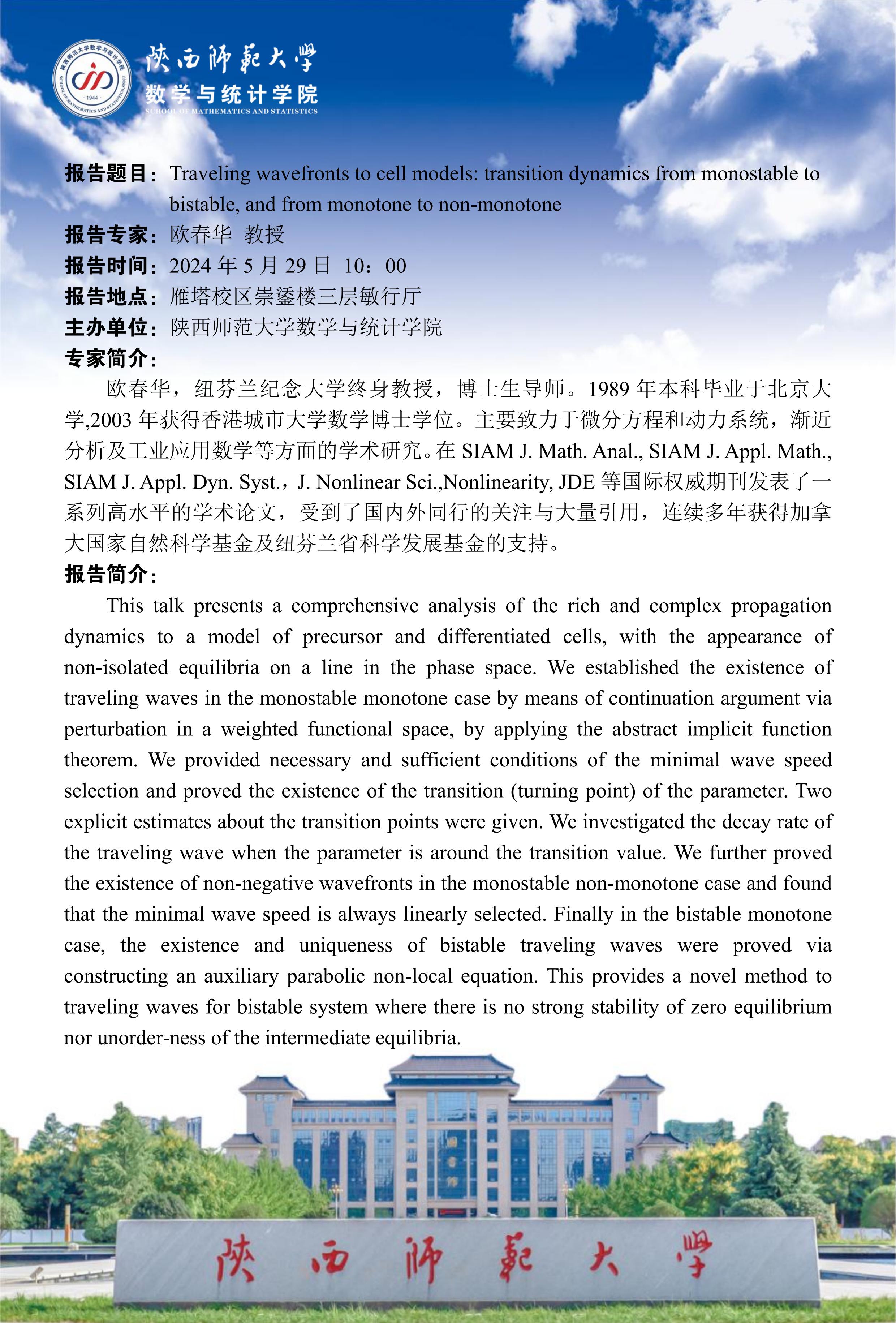 八秩同辉校庆系列47 Traveling wavefronts to cell models: transition dynamics from monostable tobistable,and from monotone to non-monotone
