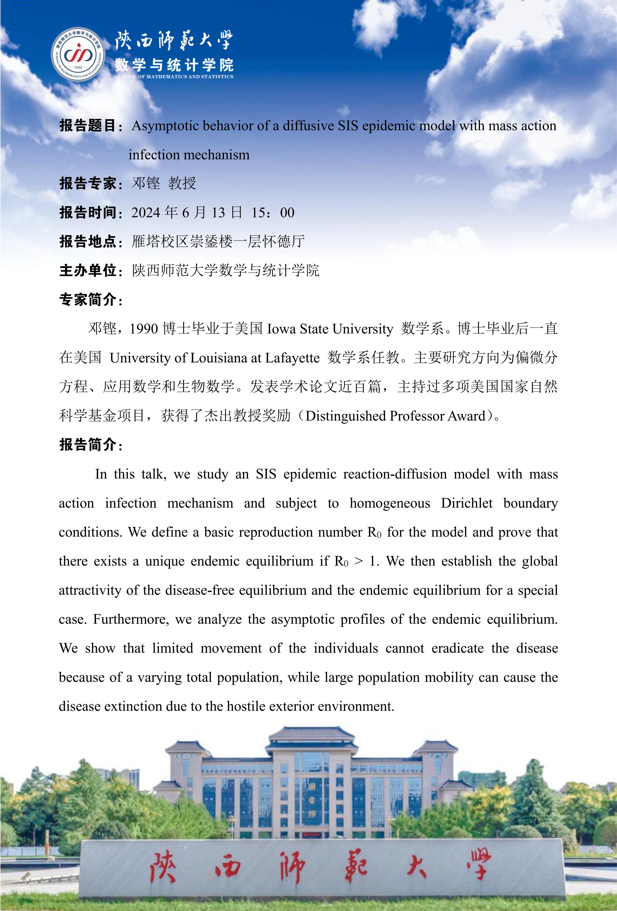 八秩同辉校庆系列55 Asymptotic behavior of a diffusive SIS epidemic model with mass actioninfection mechanism