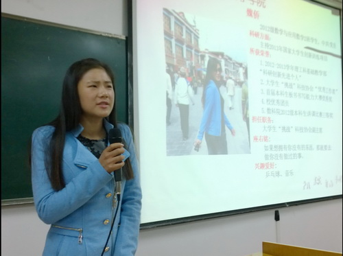 随后,魏侨、李爽、张建国三位同学先后与同学们分享了参与科研创新项目、各类竞赛以及保研等方面的经验。魏侨同学从“选题”、“组队”、“选导师”、“心态”四个方面展开与同学们分享了参与国创获得的心得。李爽同学与大家分享了与学习相关的体会,希望同学们珍惜大学时光,相信自己,抓住每一次机会,多锻炼自己。张建国同学分享了他关于考研、保研的宝贵经验与信息并告诫同学们要善于不断挑战自己、突破自我。交流会上,魏侨、李爽、张建国还与同学们进行了热烈的互动交流。同学们提出的问题涉及到学习状态、数学研究分类、数学竞赛、数学建模等等,三位优秀学子都一一作答。