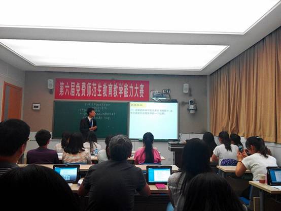受到衣军潼同学精彩表现的感染,16日下午,数学三班韩创龙同学也沉着应战。首先围绕“谈谈三维目标中的过程性目标在课堂教学中的体现”这一话题,结合古典概型的三个过程性方法阐述了自己的观点。其次,在讲解古典概型的知识时,整齐的板书、流畅的讲解在评委心中留下了深刻的印象,最后在回答老师提问的问题“打靶是否能体现古典概型的对称性”时,结合数学严谨、求实、准确等特点虚心求教评委老师,深入探讨,受到一致好评。最终获得三等奖。