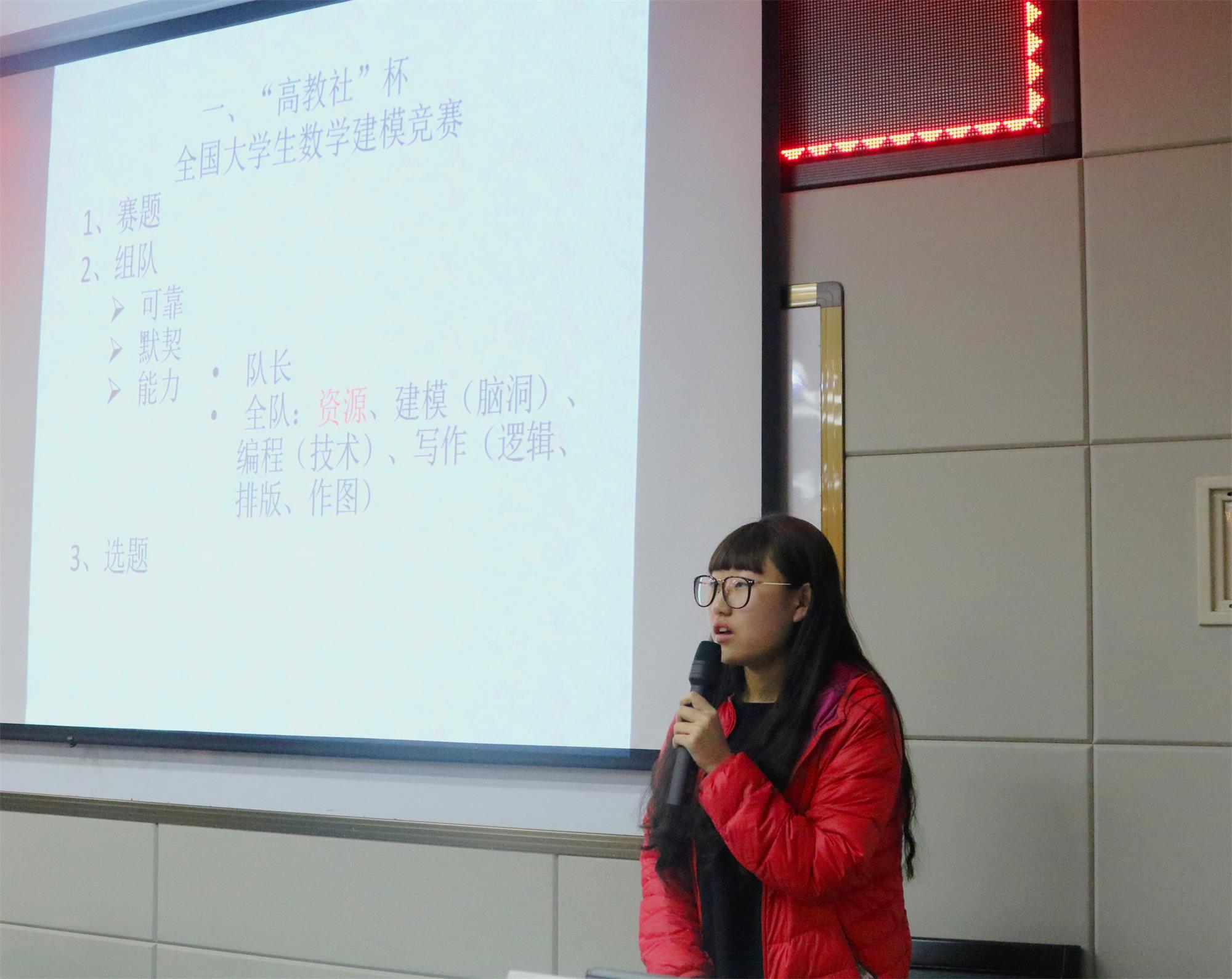 为了使同学们深入了解数学建模竞赛以及科研类项目,公司于317日晚,在文津楼二层学术报告厅举办了数学文化节之经验交流会。本次活动邀请到获得“2016年美国老员工数学建模竞赛二等奖全国老员工数学建模竞赛国家二等奖2014级本科生梁天娇,以及参与国家级老员工创新创业训练计划项目2014级本科生李宁宁向同学们分享参赛的经验心得。
