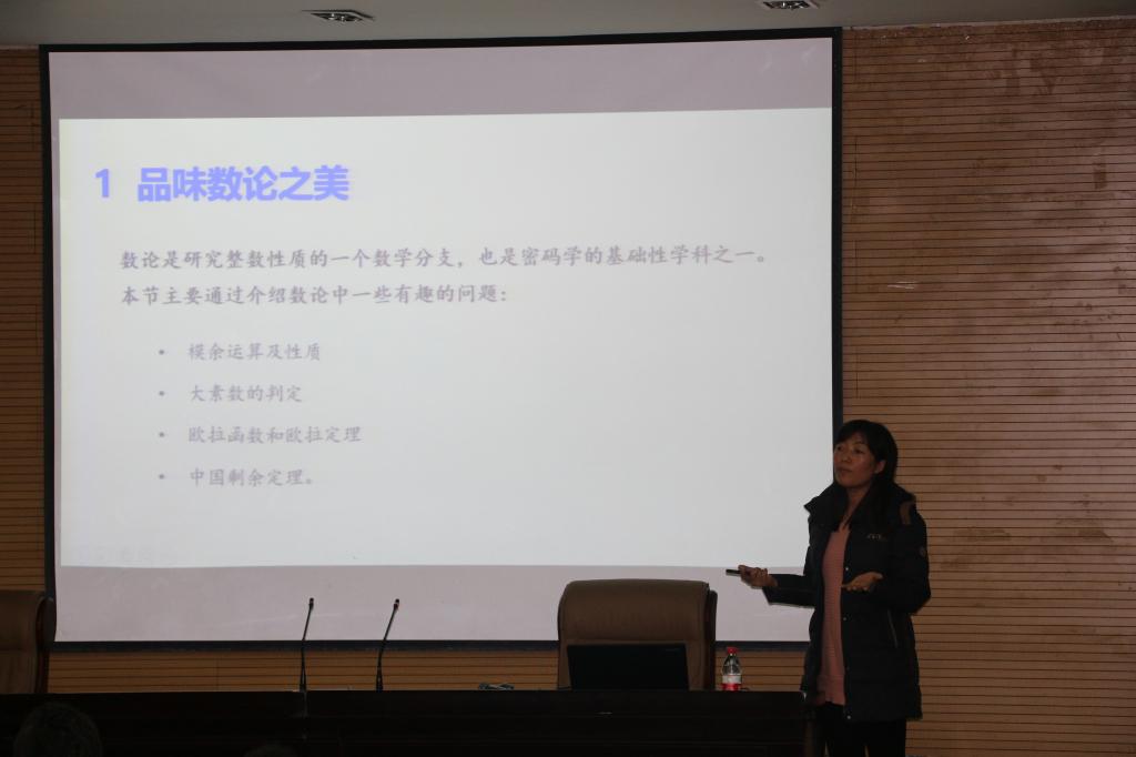 李老师首先为我们简单介绍了与密码学密切相关的数论知识,让大家品论数学之美。通过阐述模余运算方式和介绍凯撒密码、欧拉加密定理等密码学在历史上的表现,李老师与大家分享了密码学的一些基本知识,让大家领会到密码学其实是“从小学数学抽象出来的近世代数”。接着,李老师以“网银u盾”为例引入随机数的概念,利用随机数的原理,就设置个人密码上给同学们提供了一些建议。而后,同学们在李老师的讲述中见识了计算机也难解的数学问题,了解了数学在国际领域的奖项,也领略了密码学领域中的数学家风采。