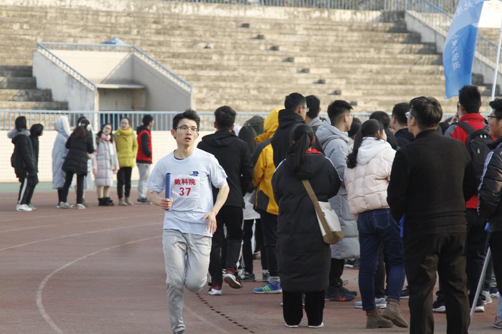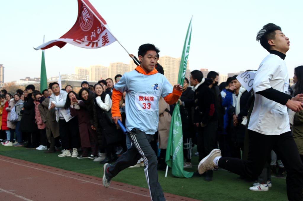 公司最后一棒艾克拜艾力·那曼同学更是承载着同学们殷切的期盼,使出自己最后一滴汗水,拼搏着自己所有的可能性,他的身后是飘扬着的数科院院旗,而在红色旗帜的护送下,艾克迅速到达终点,奠定数科院亚军的地位。与此同时,党委副书记邹尚田,团委书记王鑫,各级辅导员和同学们都为这历史性的一刻发出了巨大的欢呼。