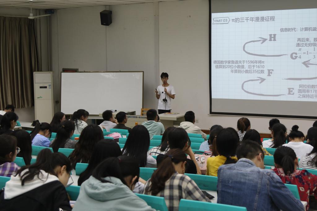 他自信从容、表达流畅,运用多种方式,生动而全面地向在座同学科普了数字π的相关知识。