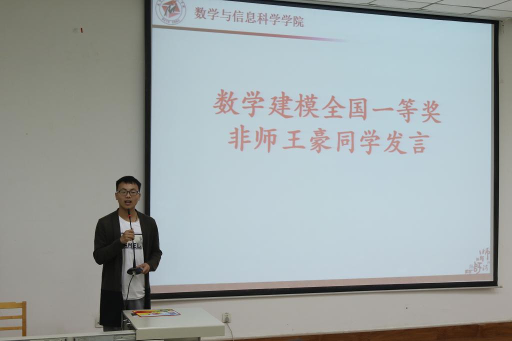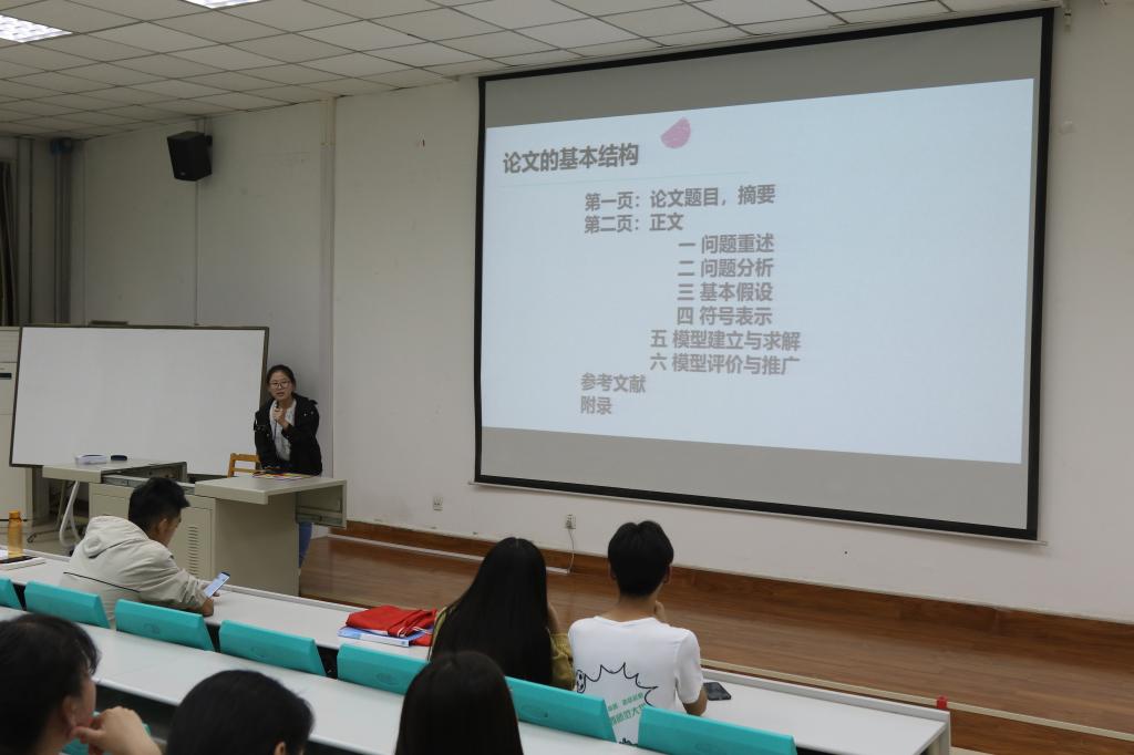 随后,王豪以现场同学注意力转化的例子,生动直观地引入了数学建模的主题,并几个建模实例为依托,对建模的重要思想进行深入而透彻的讲解,他还提到团队组建三个要点,重点强调了团队沟通的重要性。