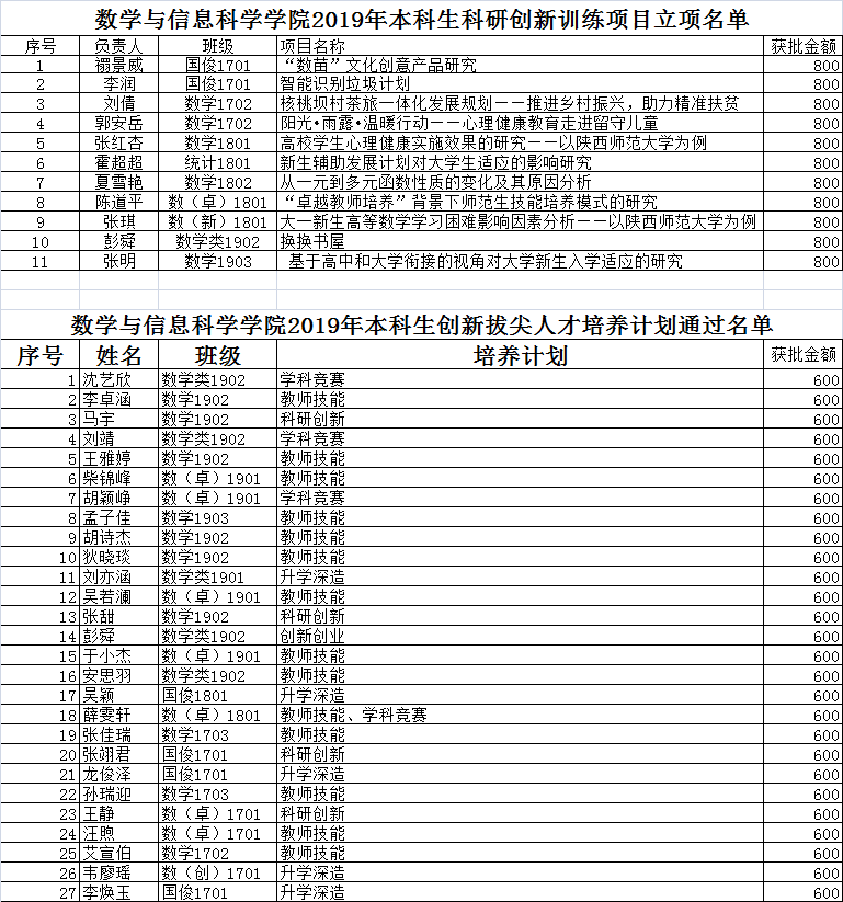 公司2019年本科生科研创新训练项目、本科生创新拔尖人才培养计划的公示