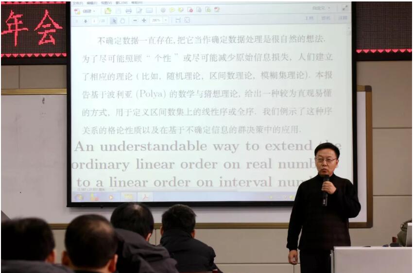 第三阶段报告会由吴保卫教授主持,李生刚教授与唐三一教授作学术报告。李生刚教授基于波利亚的数学与猜想理论,给出一种较为直观易懂的方式,用于定义区间数集上的线性序或全序,并示例这种序关系的格论性质以及在基于不确定信息的群决策中的应用。唐三一教授对药物毒理效应的普适模型及其广泛应用进行了介绍,展示了应用数学的重要性以及学科魅力,他表示应用数学对人类社会的发展起到促进作用。最后本次年度报告会在热烈的掌声中落下了帷幕。